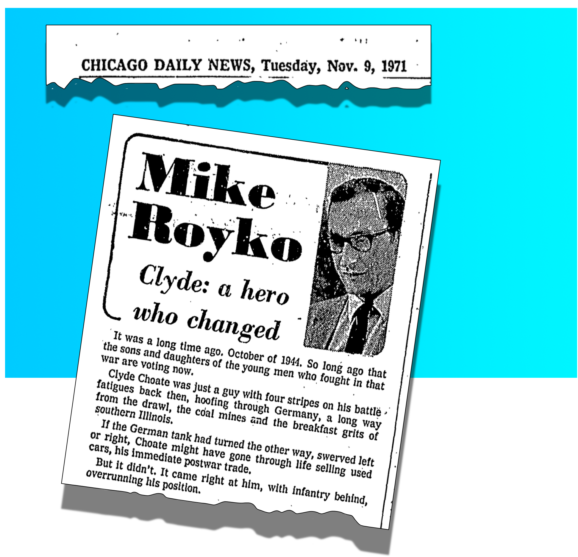 Background: As a young man, Clyde Choate fought in World War II and won the Medal of Honor for single-handedly defeating a German tank—using a bazooka to blow off its turret, shooting soldiers who jumped out, and dropping a grenade inside to finish the job. Here’s Mike’s masterful opening: