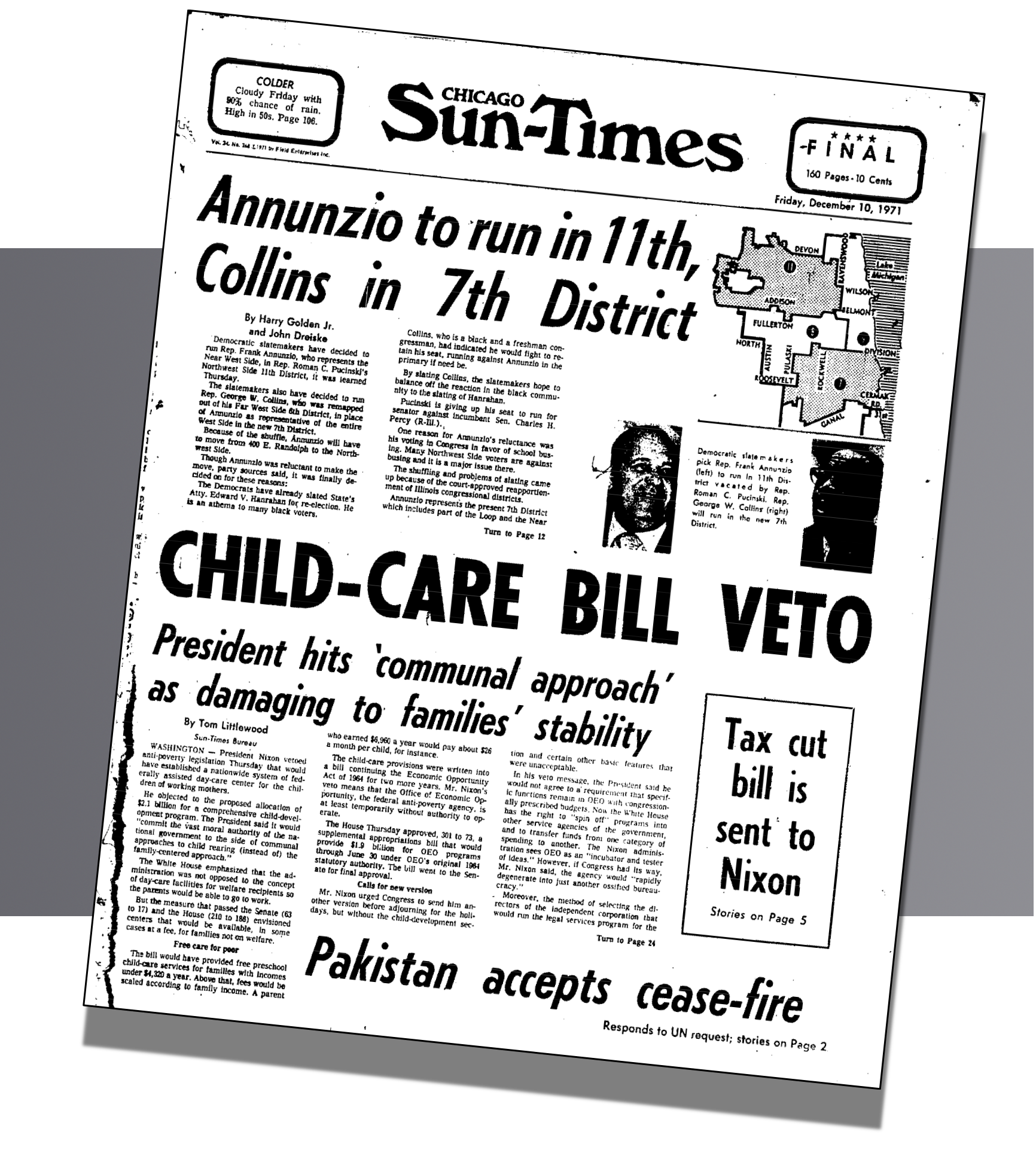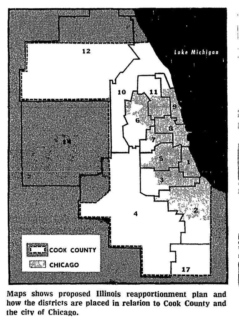 A Trib editorial noted that “Mayor Daley’s Democrats will lose two Chicago districts because of a population shift to the suburbs in the 1970 census. That reduces the number of Chicago districts from nine to seven.”