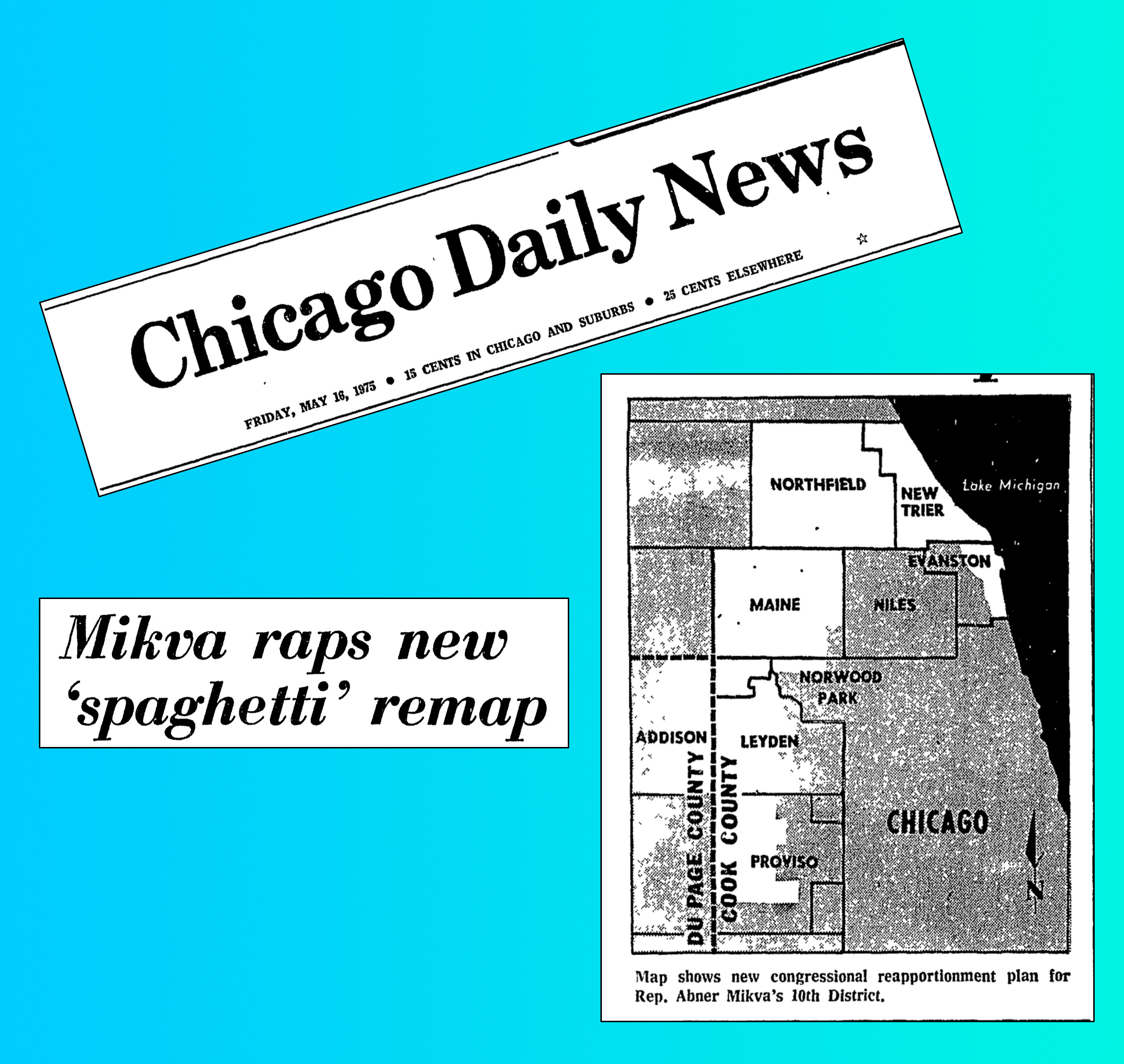 A few weeks later, Mikva called the map’s second version “a joke,” adding, “That’s not a map, that’s a spaghetti.” The second map created a 10th District that tossed Mikva together with next-door Republican U.S. Rep. Henry Hyde, who was plucked out of his 6th District.