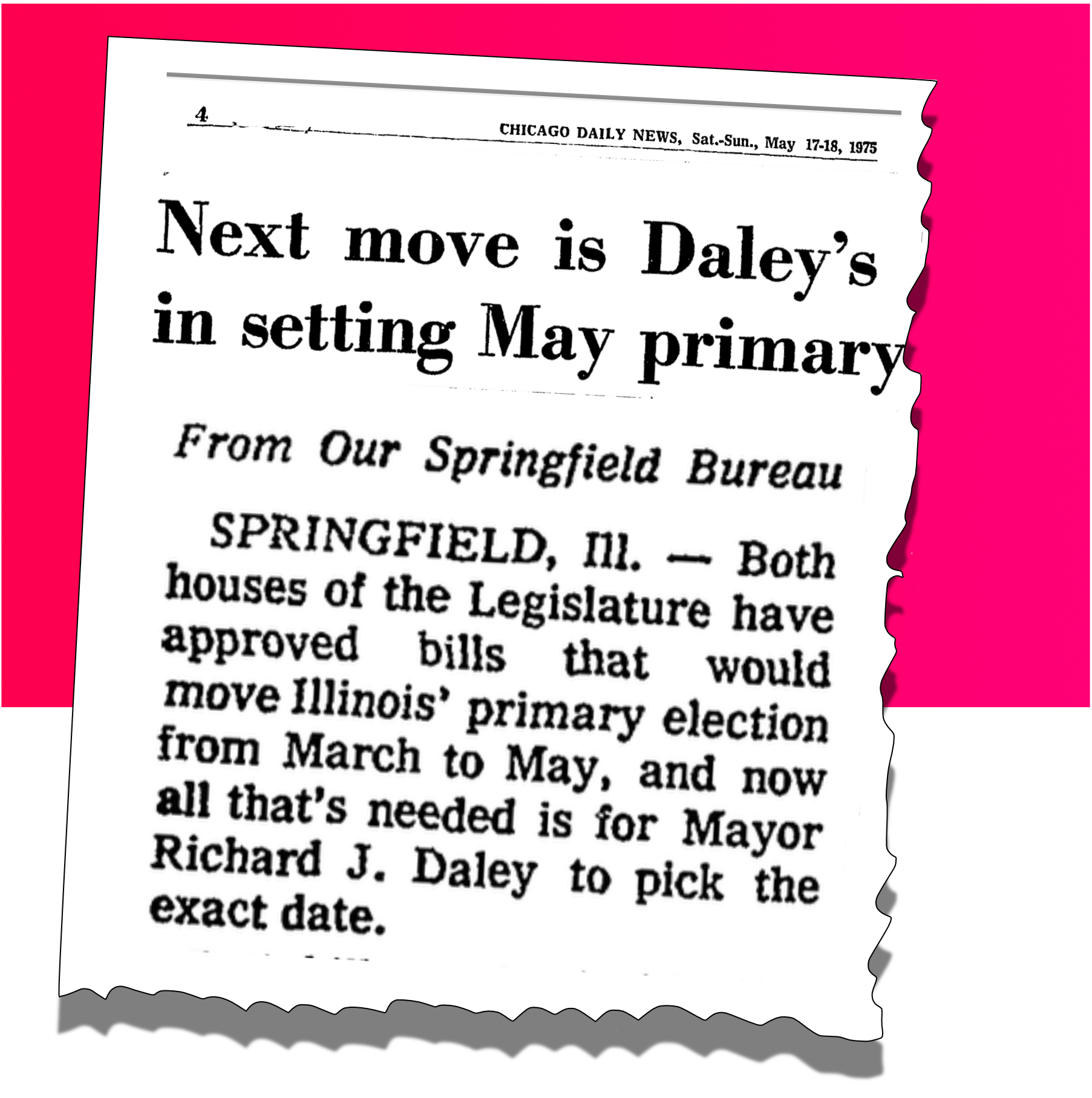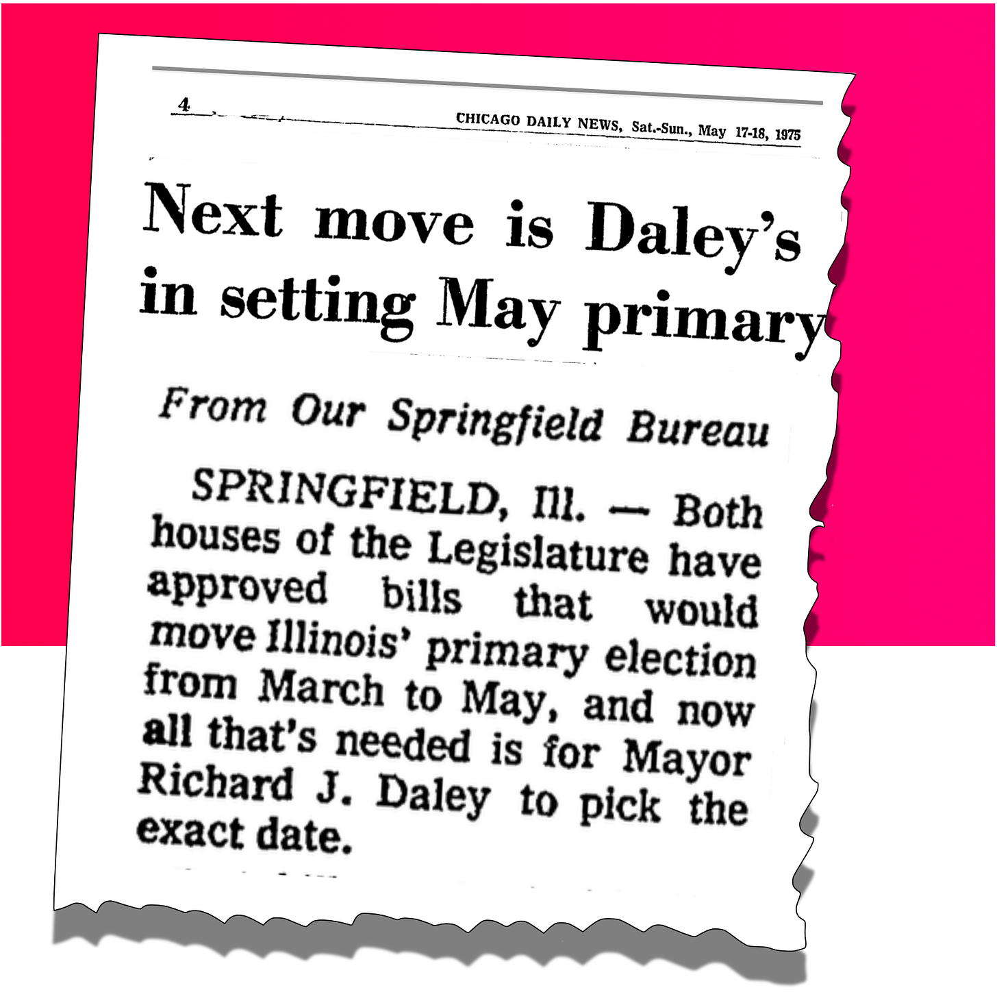 In spring 1975, Democrats—aka Mayor Daley—controlled both chambers of the Illinois legislature. Mayor Daley’s people had passed a bill in the House moving the state primary from March to the first Tuesday in May, starting in 1976. His bill in the Senate moved the primary to the second Tuesday in May. Maybe Mayor Daley was keeping his options open a few more weeks while he decided on his spring vacation dates. Who can know.