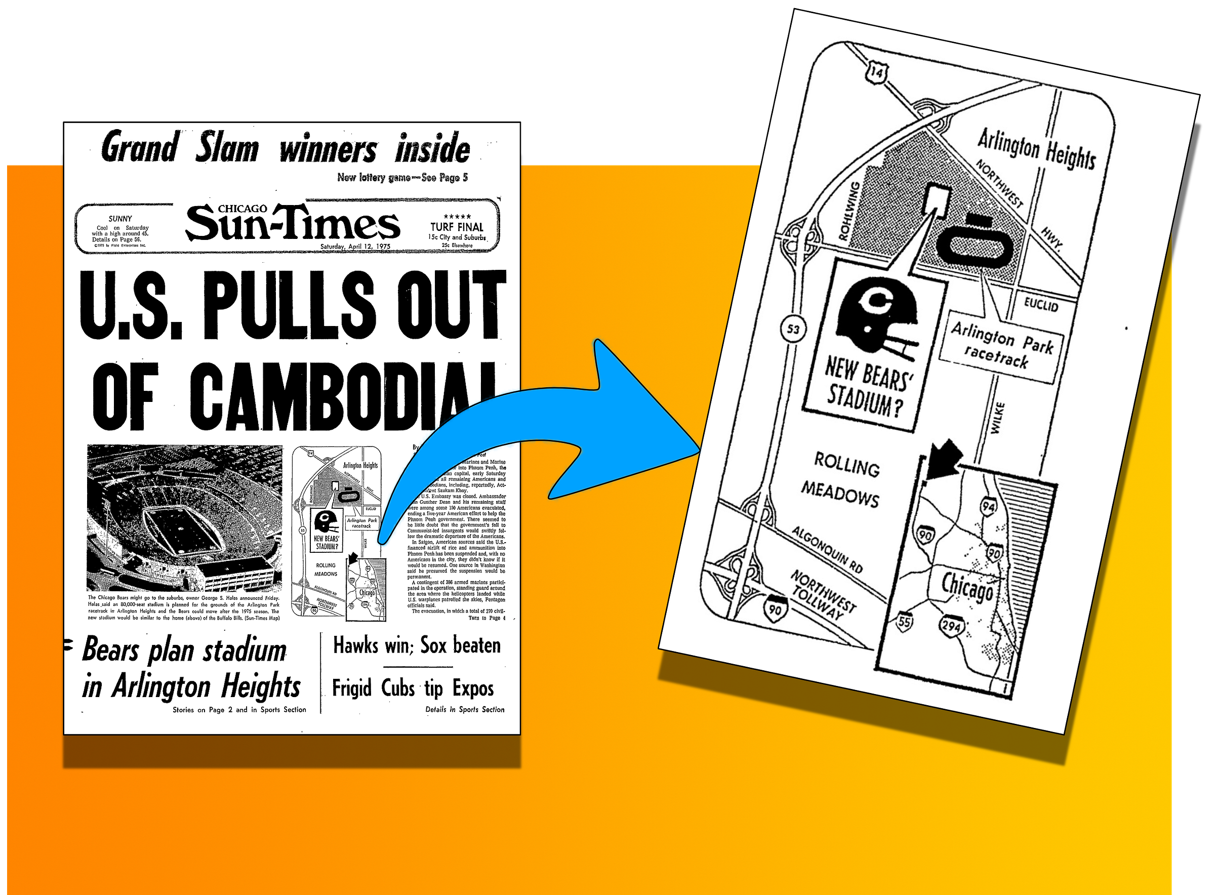 “It’s been 11 years since a committee was formed in Chicago to study the feasibility of a new stadium and we’re still in Soldier Field,” Mugs complained to reporters. Mugs and Papa Bear said the search for a new home was officially over. The Bears had an option to stay in Soldier Field until 1976, and they hoped to flee to the suburbs by ‘77.