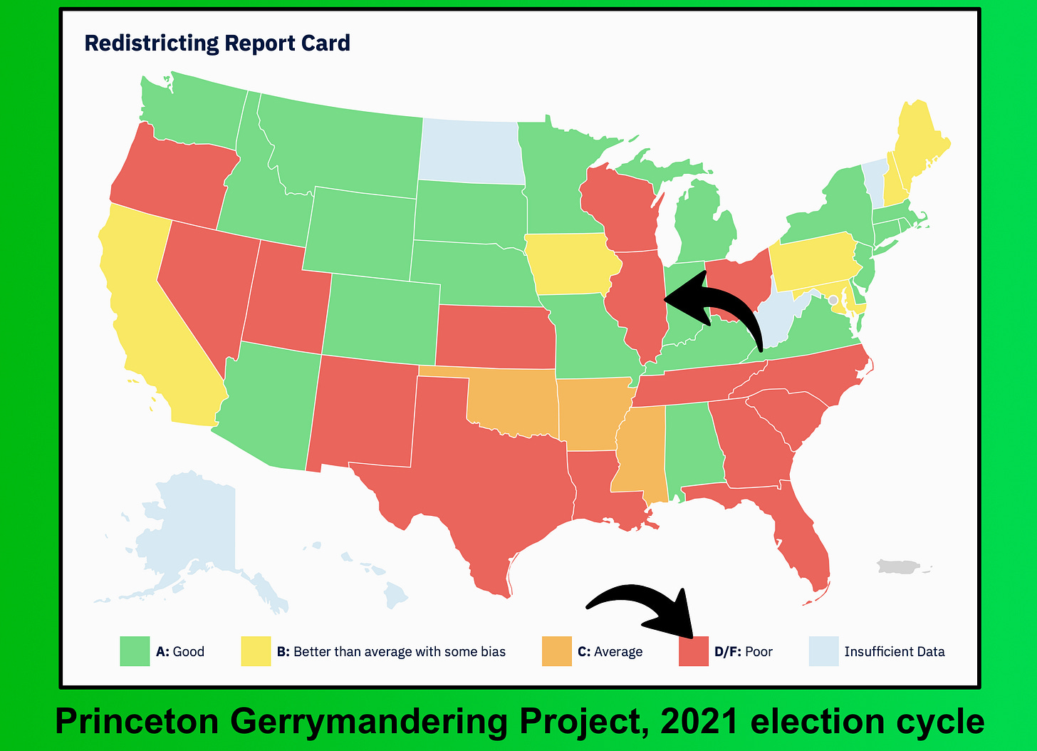 Newsom’s potential stab at redistricting looks considerably more serious than Pritzker’s, with California’s map more likely capable of eking out a few more Democratic seats. Illinois’ current map is already so gerrymandered that it will be tetchy indeed to invent new Democratic representatives without conjuring them out of thin air. Republicans were only able to win three out of 17 Congressional seats in 2024, even though Trump won Illinois with 44% of the vote. That’s why Illinois got an “F” from the Princeton Gerrymandering Project’s redistricting report card for the 2021 election cycle, though Pritzker blamed the egregious gerrymander on anonymous kindergarteners instead of a Democratic-controlled legislative map….that he signed off on after campaigning for governor with promises to push for a state constitutional amendment establishing a nonpartisan redistricting commission.