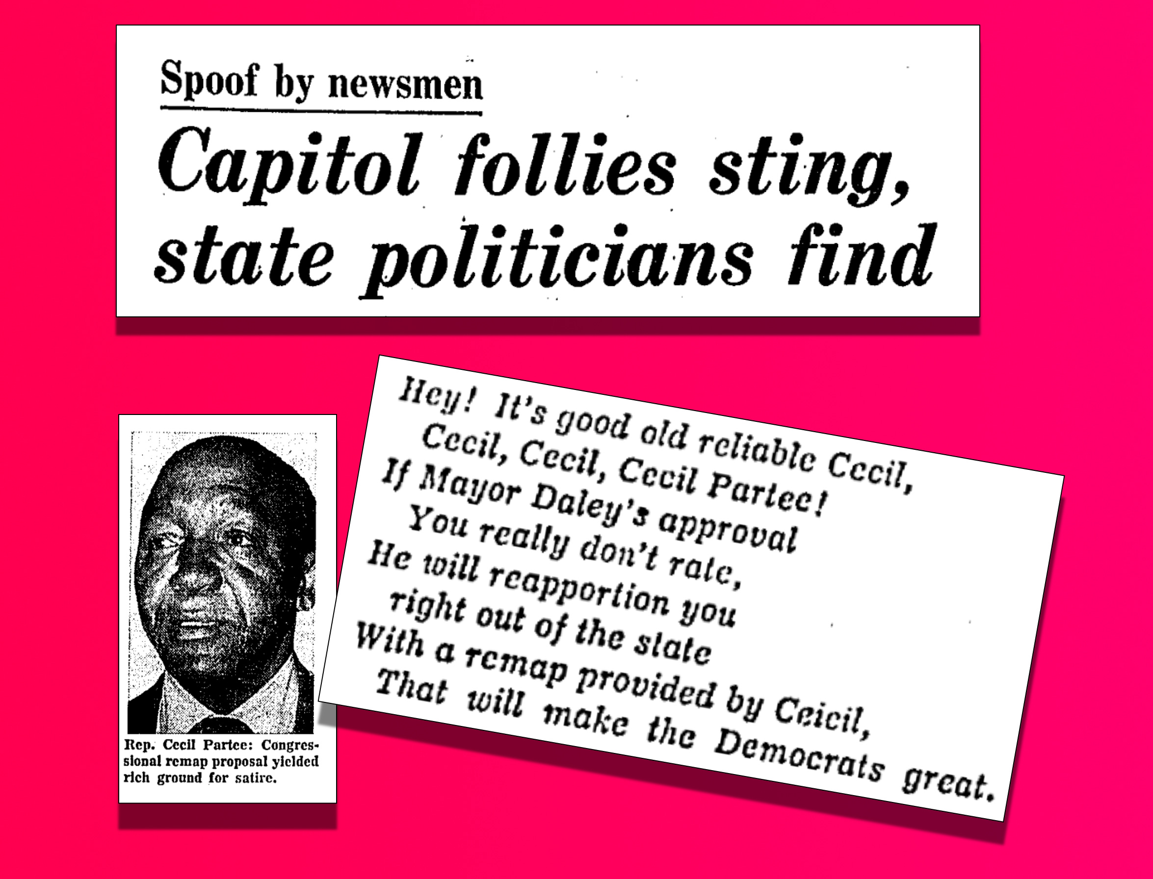 In the middle of all this, the Illinois Legislative Correspondents Association performed its fourth annual gridiron show, the biggest show in Springfield we can assume on the evening of May 13, 1975. A featured sketch included a parody of the “Guys and Dolls” classic “The Oldest Established Permanent Floating Crap Game in New York,” sung for Cecil Partee rather than Nathan Detroit.