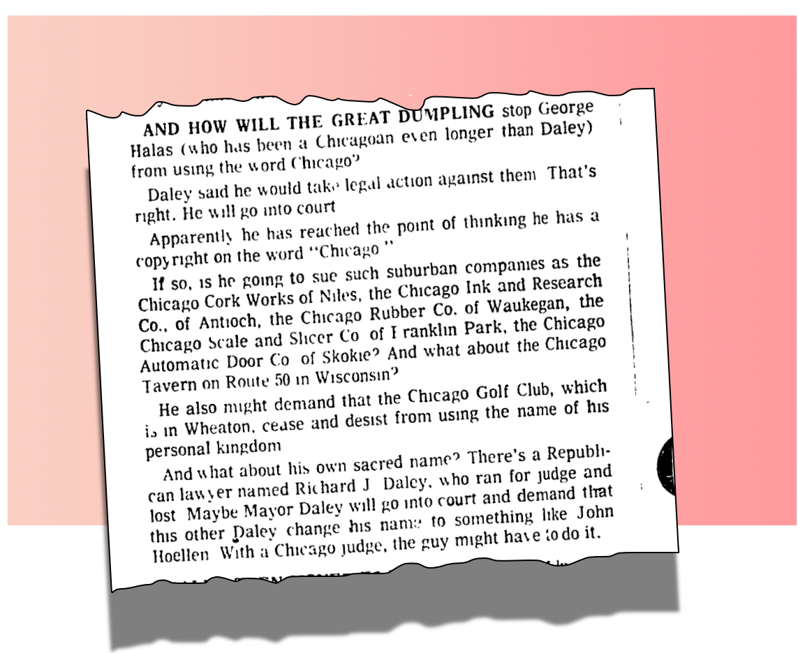 “And how will the Great Dumpling stop George Halas (who has been a Chicagoan longer than Daley) from using the word Chicago?” asked Mike, using one of his nicknames for Mayor Daley.