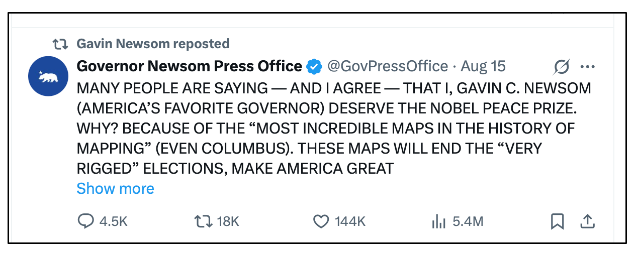 Pritzker and Newsom are battling each other for the 2028 Democratic presidential nomination right now as much as they’re fighting the good fight against Trump, but whatever. It’s a fun warm-up. Pritzker’s billionaire joke fell flat at last year’s Democratic National Convention, so he clearly workshopped his unapologetic I’m-a-billionaire routine before trying it out again on national TV with Colbert. Newsom either has a fabulous staff of Hollywood comedy writers put out of work by AI, or fabulous AI. Either way, it bodes well for a fun 2028 campaign cycle.