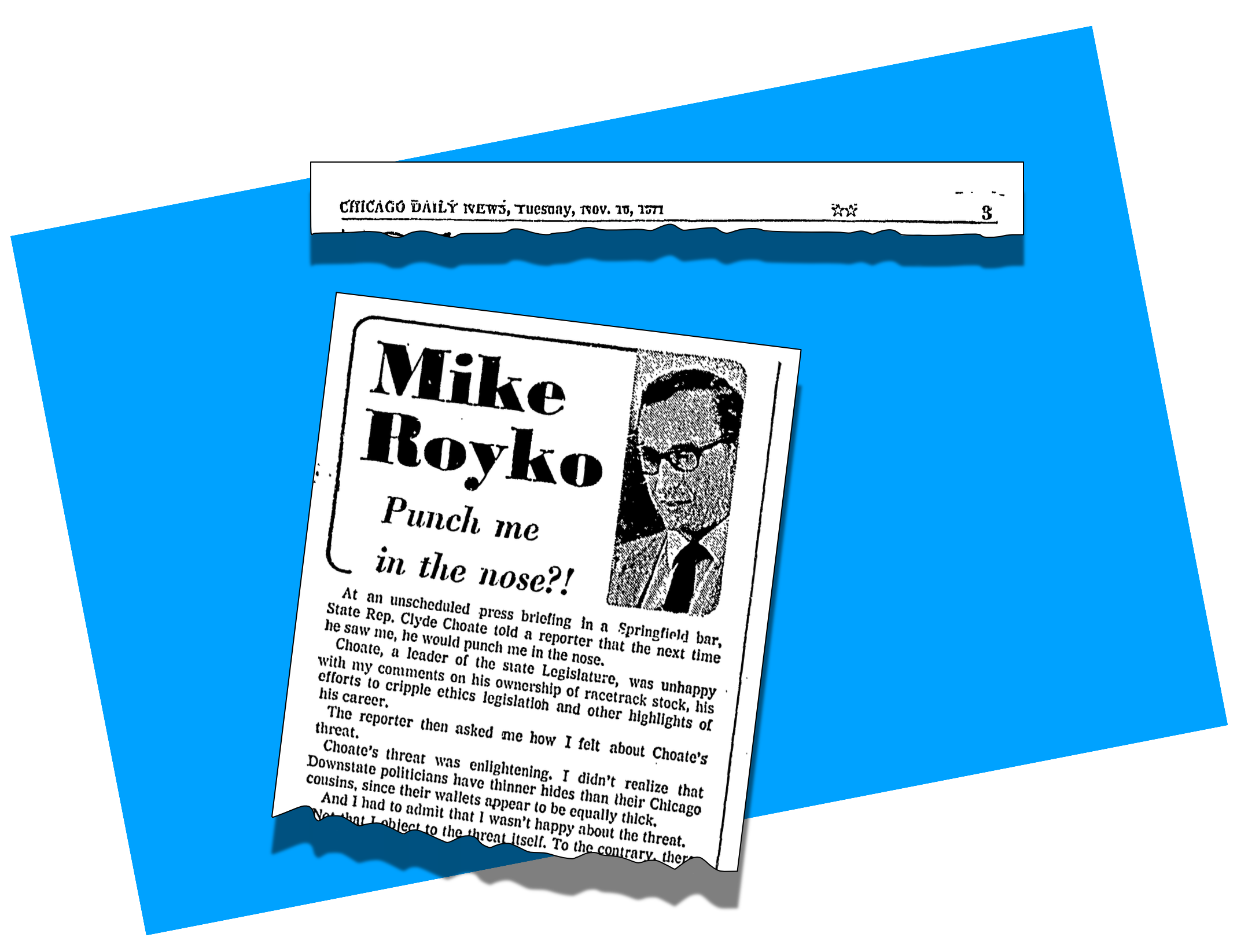 Soon after the column ran, Clyde Choate threatened to punch Mike in the nose, giving Royko another good column’s worth of material. “At an unscheduled press briefing in a Springfield bar, State Rep. Clyde Choate told a reporter that the next time he saw me, he would punch me in the nose,” wrote Mike.
